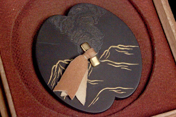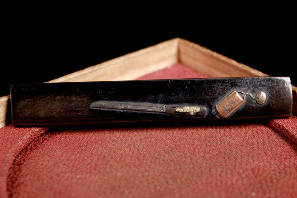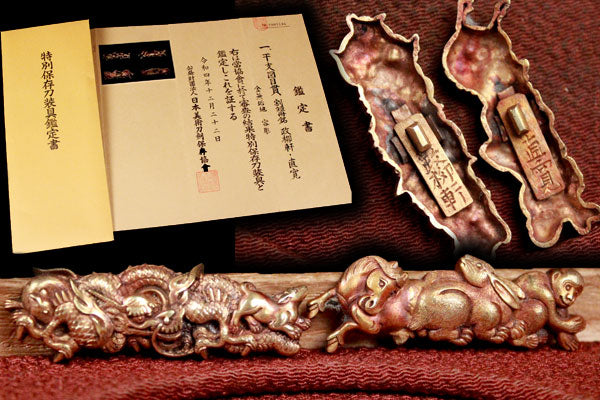 【喜】金無垢地 重さ約15ℊ!! 割短冊銘 ( 正柳軒・直寛 )!! 干支図目貫!! 座布団付木箱!! 小道具刀装具‼ 座布団付木箱!!【特別保存刀装具鑑定書】111370