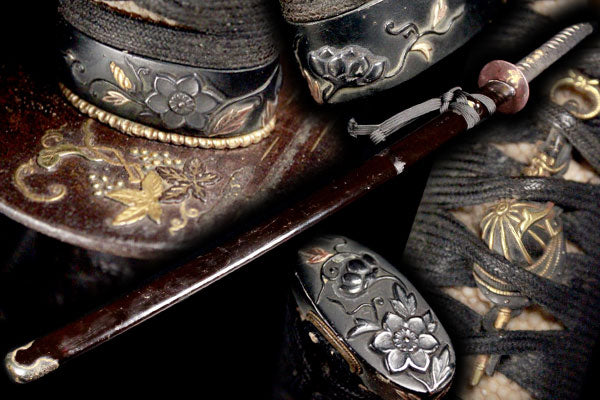 【喜】花蝶小尻‼ 赤銅花縁頭!! 甲冑目貫!! 花鍔!! 素晴らしい時代刀用拵え‼ 刀装具!! 111299