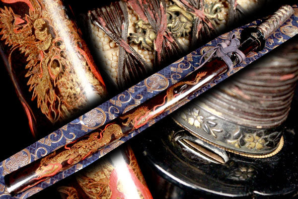 | 【喜】見事な龍蒔絵‼ 赤銅花の古そうな縁頭!! 革柄巻龍目貫拵え!! 刀装具!! 112669 | - |