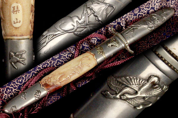 【喜】大蔵屋敷より!! かなり貴重拵え!! 素晴らしい細密技工の千鳥銀に在銘風景図!! 花鳥短刀剣拵え!! 鍔切羽!! 木箱!! 刀装具!! 109256