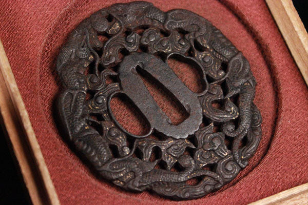 | 【喜】鉄に双雲龍透かし大鍔!! 刀装具武具!! 座布団付木箱 111862 | - |
