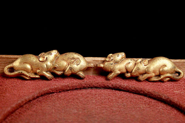 【喜】金双ネズミ目貫‼ 刀装具武具‼ 座布団付木箱!! 111999